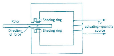 The shaded-pole structure as shown in figure below is generally actuated by current flowing in a single coil on a magnetic structure containing an air gap. The air gap flux produced by this current is split into two out of phase components and hence called shading ring generally of copper that encircles part of the pole face of each pole at the air gap.