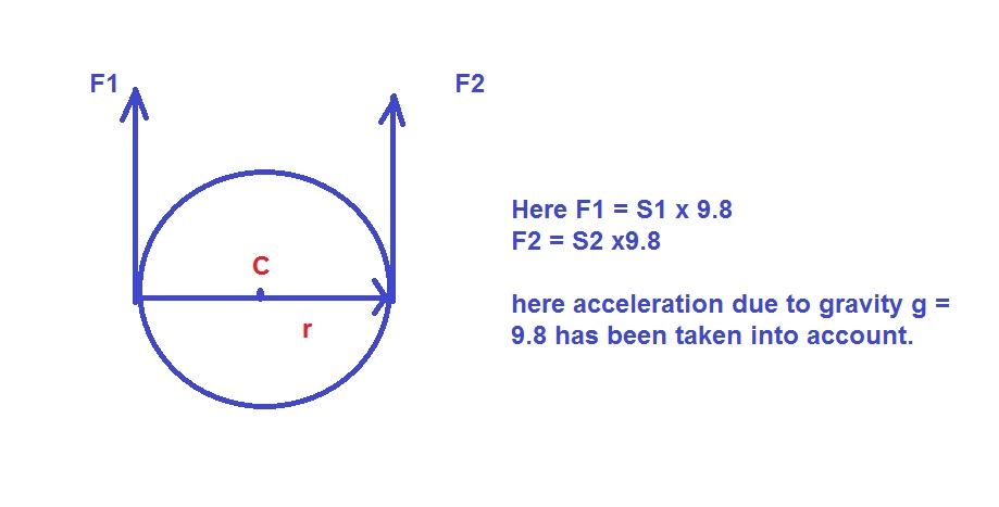 A belt around the air cooled pulley has its end attached to the spring balance S1 and S2. Using belt tightening hand wheels H1 and H2, the load of motor is adjusted to its rated value. Assuming the spring balance to be calibrated in kilogram, then rated load on the DC motor is given as