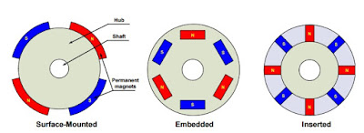 A rotor consists of a shaft and a hub with permanent magnets arranged to form between two to eight pole pairs that alternate between north and south poles. Figure below shows cross sections of three kinds of magnets arrangements in a rotor.