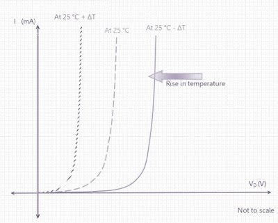As shown in the graph above the curves at different temperatures are shown far apart just for illustration purpose. The curve shifts to the left at the rate of -2.5 mV per degree centigrade change in temperature. Hence if the temperature increases from room temperature (25° C) to 80° C, the voltage drop across the diode will be (80-25) x 2.5 mV = 137.5 mV.