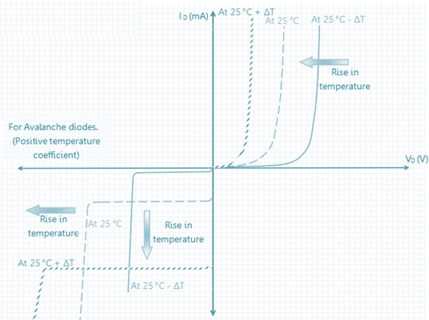 From the above graph it is clear that the reverse saturation current increases with increase in temperature. The graph also shows how the reverse breakdown voltage changes with temperature. It is indicated in the above graph that the reverse breakdown voltage increases with an increase in temperature. However it is only true for avalanche diodes. The reverse breakdown voltage for Zener diodes decreases with an increase in temperature.