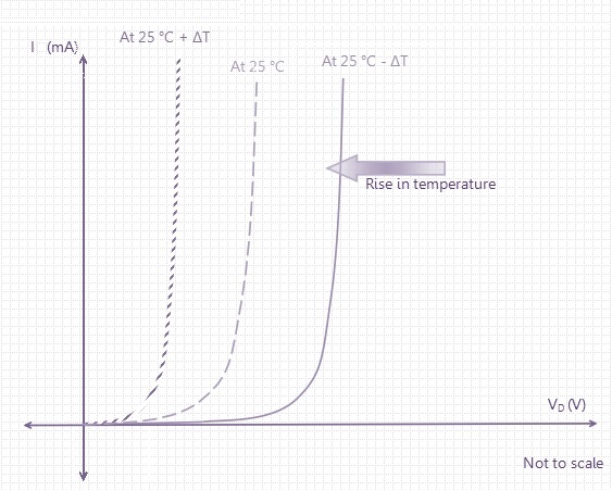 As shown in the graph above the curves at different temperatures are shown far apart just for illustration purpose. The curve shifts to the left at the rate of -2.5 mV per degree centigrade change in temperature. Hence if the temperature increases from room temperature (25° C) to 80° C, the voltage drop across the diode will be (80-25) x 2.5 mV = 137.5 mV.