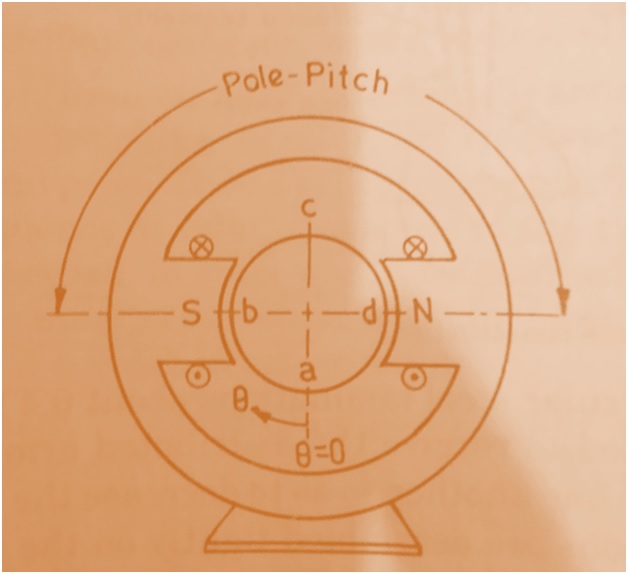 Consider a two pole machine as shown in figure below. Suppose a conductor is rotating at a constant angular velocity. When the conductor is at a, emf induced in the conductor is zero as the magnetic field at a is zero.