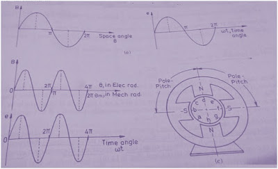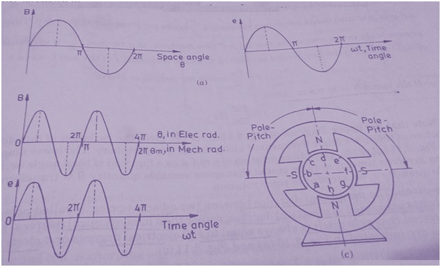 Mind that the waveform of magnetic field as well as the induced emf are same as discussed earlier in the post. Thus one complete revolution of conductor results in one complete cycle of induced emf. In other words, we can say that 360° mechanical rotation of conductor results in 360° change in the induced emf for two pole machine.