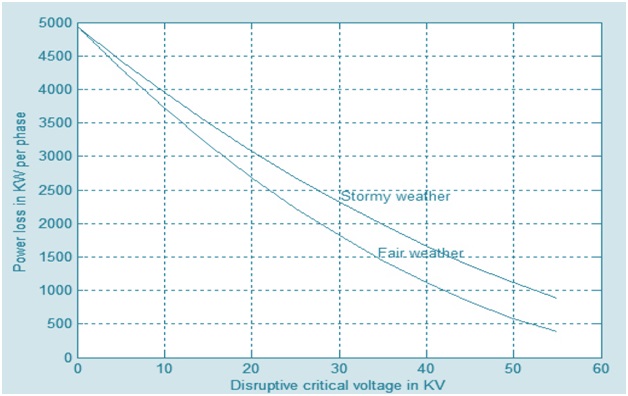 Stormy or bad atmospheric weather conditions like snows, rains and hailstorm reduce Disruptive Critical Voltage and increases the corona effects. Figure below shows the graph of corona loss at both the stormy and the fair weather conditions at different values of Disruptive Critical Voltages. The results show that the lower the value of disruptive critical voltage, the higher the power loss due to corona.