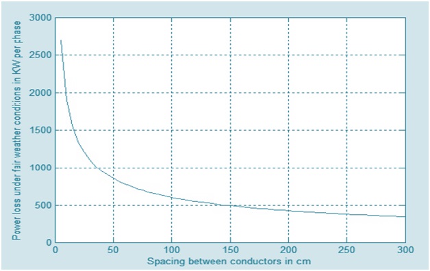 Figure below shows the corona loss under fair weather condition at various spacing between the conductors. Corona loss is inversely proportional to the spacing between conductors. If the spacing is made to be very large, corona loss may be absent.