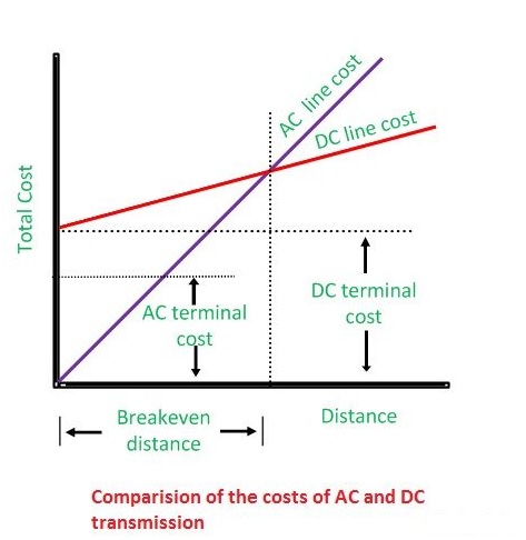 It can be seen from the graph that there is a point corresponding to line length= 800 km where the cost of HVAC and HVDC are equal but beyond 800 km the cost of HVDC is less compared to HVAC. This 800 km is called Break even distance. Thus for transmission more than 800 km, it is cheaper and efficient to use HVDC.
