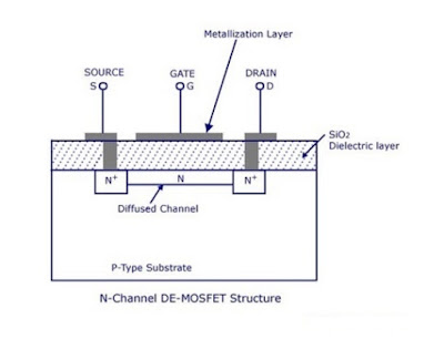 For a Depletion type MOSFET, everything is the same except only that the channel is already implanted in the substrate through diffusion. Hence, a current can flow between the source and drain even at Vgs=0 Volt since charge carriers are already present and there is no need to apply a bias voltage to create a region of excess carriers near the gate region.