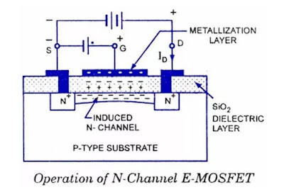 For example, for the n-channel depletion type MOSFET shown above, the channel has already been implanted into the substrate by diffusion and this is how the device looks without any bias. Compare that to how an enhancement MOSFET looks WITH BIAS as shown in above figure. For the above device, if we start to increase the gate-source voltage, more and more holes will move away from the channel and thus the channel will be deepened, enhanced, as more and more excess uncovered electrons will be left behind by the leaving holes.