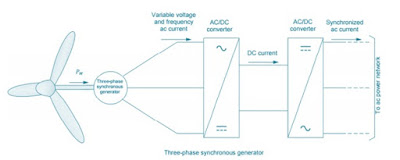 In this setup, the generator rotates at a speed that is proportional to the wind speed. The AC currents produced by the generator are converted into dc current by an AC/DC converter, and then converted by another AC/DC converter back to AC currents that are synchronous with the AC power network. It is therefore necessary for the power electronics devices used in such a circuit to have the size and capacity to process 100% of the generator output power.