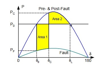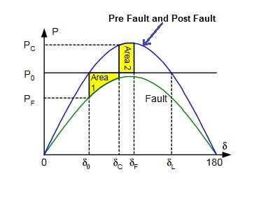 However, because of the inertia of the rotor system, the angle does not start to go back to δ0 immediately. Rather, the angle continues to increase till δF such that energy lost during deceleration in Area 2 is equal to the energy gained during acceleration in Area 1. This is called Equal Area Criterion.