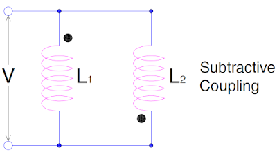 Suppose two inductors with inductance L1 and L2 are connected in parallel as shown in figure below. The coupling between the inductors is assumed to be subtractive. This coupling is shown by two dots on the opposite side of the inductor in the figure.