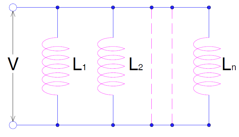 Consider the figure below. In the figure n inductors having inductance of L1, L2,…..,Ln are connected in parallel and a voltage V is applied. Let current I1, I2,….In is flowing through the inductors L1, L2,……Ln.