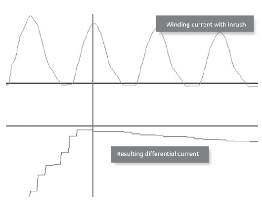 Magnetizing Inrush Current during Fault Clearing. An external fault may significantly reduce the system voltage, and therefore reduce the excitation voltage of the transformer. When this fault is cleared, the excitation voltage returns to the normal system voltage level. The return of voltage may force a dc offset on the flux linkages, resulting in magnetizing inrush current. This magnetizing inrush current will be less than that of energization, as there is no remnant flux in the core. The current measured by the differential relay will be fairly linear due to the presence of load current, and may result in low levels of second harmonic current.