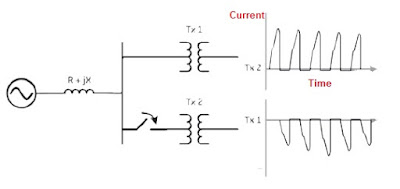 Sympathetic inrush. Energizing a transformer on the power system can cause sympathetic magnetizing inrush currents to flow in an already energized parallel transformer. Energizing the second transformer causes a voltage drop across the resistance of the source line feeding the transformers. This voltage drop may cause a saturation of the already energized transformer in the negative direction. This saturation causes magnetizing inrush current to supply the flux. The magnitude of the magnetizing inrush current is generally not as severe as the other cases.