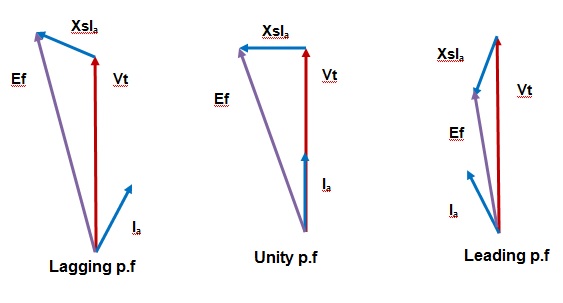 Let us consider the phasor relation between the excitation voltage Ef and terminal voltage Vt for lagging, unity and leading power factor loads as shown in figure below.