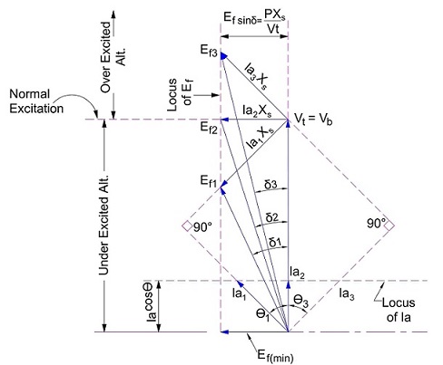 For Ef3 more than Ef2, load current Ia3 lags behind the terminal voltage Vt. In this case, the generator is overexcited and therefore delivers the reactive power to the Grid / Infinite Bus.