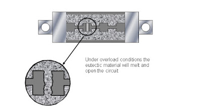 As clear from the figure above, the fuse element have a portion of Tin Alloy, known as a Eutectic Material. This alloy is used to give the fuse specific operating characteristics. Also, constrictions in the fuse element are provided which play a very vital role in the operation of Fuse. The space between the body surrounding the Fuse element is filled filling powder such as with Silica Send, Chalk, plaster of peris etc.