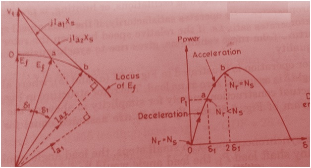 In the figure above, this situation correspond to point ‘b’. Now, the power output will start to come down to point ‘a’ where the power output is equal to the load demand P1 but at this point ‘a’ the speed to rotor is more than the synchronous speed hence the load angle will continue to come down to zero as we have assumed lossless system. Note that below point ‘a’ the Motor will decelerate as Pout <P1 but above point ‘a’ the rotor will accelerate as Pout >P1.