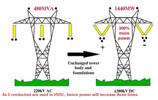 Thus we see that power Transmission Capability of Bipolar HVDC Line is same as 3-phase single circuit HVAC Line. But in case of HVDC, we only need two conductors while in 3-phase HVAC we need three conductors, therefore number of Insulators for supporting conductors on tower will also reduce by 1/3. Hence, HVDC tower is cheaper as compared to HVAC.