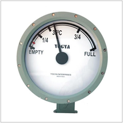 This Magnetic Oil Gauge or MOG is composed of a disc indicator (or a red pointer) behind a dial frame and a float linked to said indicator by means of a magnetic field of force. The dial of this device has scale from empty to full. It has some intermediate divisions such as 1/4, 1/1, 3/4. The prescribed oil level at either 30°C or 35°C ambient temperature may also be indicated on the dial depending upon the design of MOG.