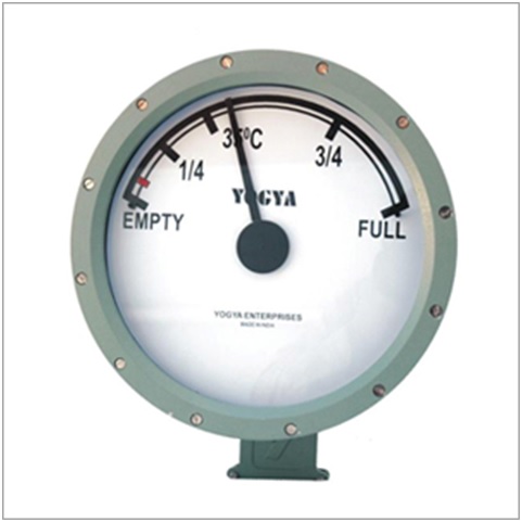 This Magnetic Oil Gauge or MOG is composed of a disc indicator (or a red pointer) behind a dial frame and a float linked to said indicator by means of a magnetic field of force. The dial of this device has scale from empty to full. It has some intermediate divisions such as 1/4, 1/1, 3/4. The prescribed oil level at either 30°C or 35°C ambient temperature may also be indicated on the dial depending upon the design of MOG.