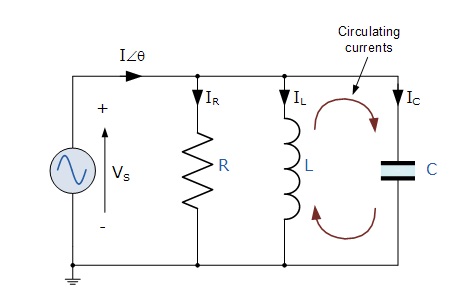 A parallel resonant circuit stores the circuit energy in the magnetic field of the inductor and the electric field of the capacitor. This energy is constantly being transferred back and forth between the inductor and the capacitor which results in zero current therefore the current drawn from the supply is equal to current flowing in Resistor i.e. IR.