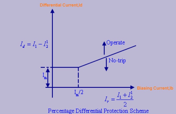 The current on the X-axis is the average current of primary and secondary winding referred to primary. It indicates the restraining current called the Biasing Current, Ibwhile the corresponding difference on Y-axis represents the differential current. The Differential Protection Relay will pick up if magnitude of differential current is more than a fixed percentage of the restraining current.