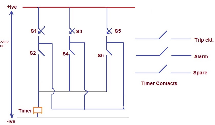 Carefully observe in the figure above that, in this configuration of contacts, the positive supply will be extended to the Timer through contact S1, S4 and S6 and therefore the Timer will initiate. After the set time period if Circuit Breaker still fails to close, Timer will actuate its contacts (Normally Open to Close) to give trip command to the three poles of the circuit breaker. In this way Pole Discrepancy Protection trips the Circuit Breaker if there is a mismatch in timing of Circuit Breaker operation.