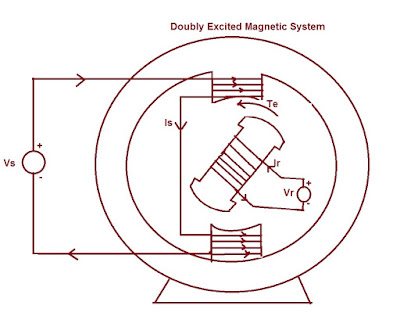 Lets us consider a doubly excited magnetic system as shown in figure below. In this model of machine, both stator as well as rotor is assumed to be salient pole type. Let’s assume that stator is energized from source Vs whereas rotor is energized with source Vr.