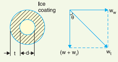 Coating of ice on conductor (it is assumed that ice coating is uniformly distributed on the surface of conductor) increases the weigh of the conductor which acts in vertically downward direction. But the wind exerts a pressure on the conductor surface which is considered horizontal for the sake of calculation.