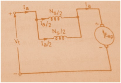Now assume the two equal halves of series filed winding is connected in parallel as shown in figure below.