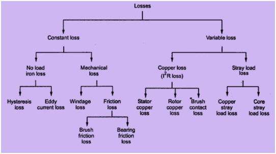 At this point, No Load Rotational Loss shall also be discussed. No Load Rotational Loss is basically sum of mechanical loss and open circuit core loss. This loss can be determined by running the electrical machine as an unloaded motor at rated speed or frequency and with armature voltage equal to normal generated emf. The total power input to the unloaded motor minus a small no load armature ohmic loss (mind that no load armature ohmic loss is applicable only for induction machine) gives the magnitude of No Load Rotation Loss. For quick and better understanding of losses in an Electrical Machine, please carefully observe the figure below and understand. In the figure below, losses are categorized into two parts, one which is considered constant, hence called Constant Loss and other which are dependent on load current and hence they are Variable Loss.