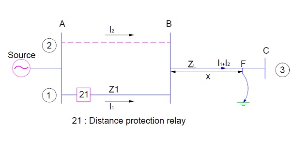 As the relay setting is assumed (Z1+ZL) therefore the reach of relay is (Z1+ZL). A fault occurs at point F on line 3 at a distance x from B. This fault will be fed by line 1 as well as line 2. Notice that line 2 is also feeding the fault. This is called remote infeed.