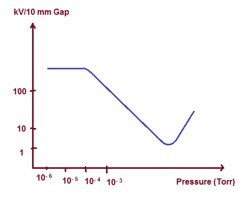 The breakdown voltage of contact gap varies with the absolute pressure in the vacuum circuit breaker interrupter unit. As the absolute pressure is reduced from 10-1 Torr to 10-3 Torr, the dielectric strength (kV/mm) increases but above 10-4 Torr, the breakdown strength and pressure characteristic becomes almost flat as shown in figure below.