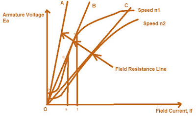 If the field resistance is increased to OA, then Field Resistance line intersect the OCC curve at point p, and hence there will not be voltage build up beyond point p.