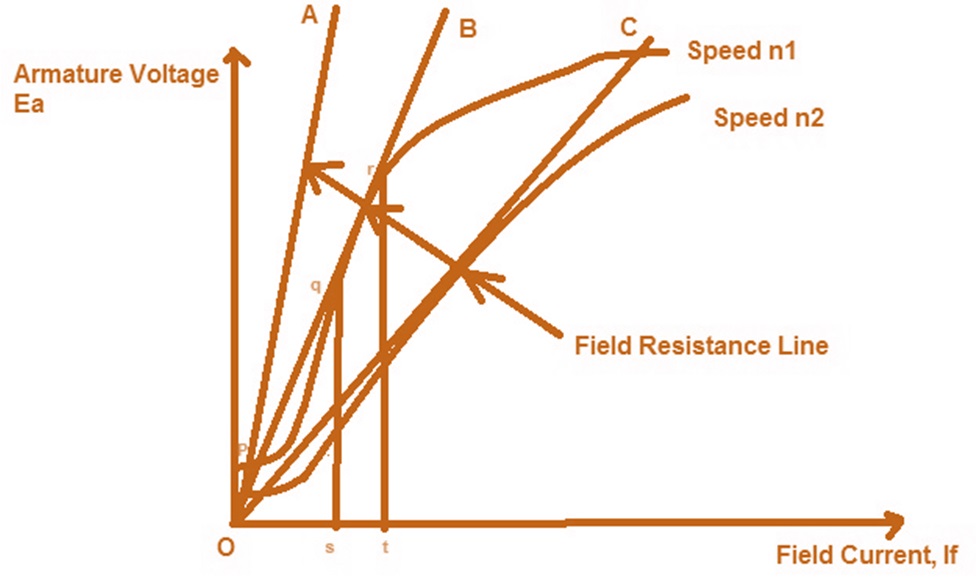 Now, if shunt field resistance is such that OB represents the Field resistance line then as clear from the figure above, the lone is intersecting the OCC curve at many points between q and r, therefore the field current will fluctuate between s and t and hence the voltage generated at the terminals of DC Shunt Generator will vary from qs to rt resulting in unstable condition. If we find the slope (tanƟ) of the Field Resistance Line then we will get Field Resistance value which is known as Critical Filed Resistance. Here Critical Field Resistance = tanƟ = qs/Os