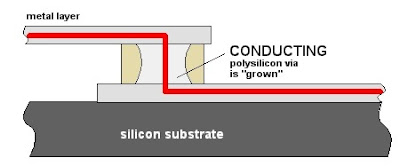 It is a Programmable Chip Technology that creates permanent, conductive paths between transistors. In contrast to “Blowing Fuses” in the fusible link method, which opens a circuit by breaking the conductive path, the Antifuse method closes the circuit by “growing” a conductive layer via two metal layers in between a layer of non-conductive, amorphous silicon is sandwiched as shown in figure below. When voltage is applied to this middle layer, the amorphous silicon is turned into poly-silicon, which is conductive.