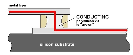 It is a Programmable Chip Technology that creates permanent, conductive paths between transistors. In contrast to “Blowing Fuses” in the fusible link method, which opens a circuit by breaking the conductive path, the Antifuse method closes the circuit by “growing” a conductive layer via two metal layers in between a layer of non-conductive, amorphous silicon is sandwiched as shown in figure below. When voltage is applied to this middle layer, the amorphous silicon is turned into poly-silicon, which is conductive.