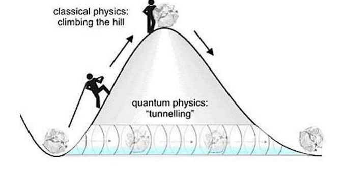 The above effect makes it very convenient for electrons to move and they are not allowed to jump from the lower energy level to the higher energy just like that; what happens here is quantum tunnelling, an effect where modern physics shows that electrons teleport through thin wall as shown in figure below.