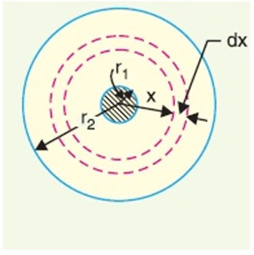 For calculating the insulation resistance, we take an infinitesimally small layer of insulation of thickness dx at a radius R from the centre of the cable conductor. The length of insulation from where leakage current will flow is dx and area of cross-section will be 2πxL (A cylinder of length L and radius x).