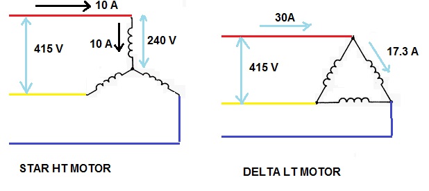 - The second most important reason is that, starting current for Motors is 6 to 7 times of full load current. So start-up power will be large if HT motors are delta connected. It may cause instability i.e. voltage dip in case of small Power System. In STAR connected HT Motors starting current will be less compared to delta connected motor as voltage is Vph and current is line current. So starting power and starting torque are reduced.