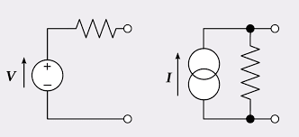 For Ideal Voltage Source, series resistance = 0 while for Ideal Current Source parallel resistance is infinite.