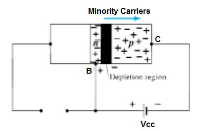 Thus for the above situation only minority carriers i.e. holes flows from the n-side to the p-side. To summarize, we can say that one p-n junction of a transistor is reverse biased, while the other is forward biased under normal operating condition.