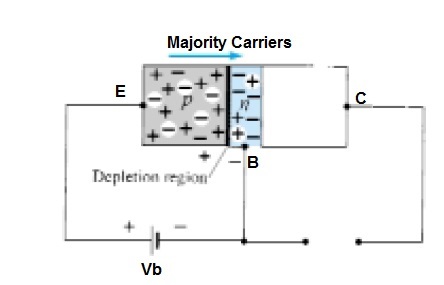 As obvious from the figure above, Emitter to Base junction is forward biased, therefore majority carriers i.e. holes from the Emitter side to the Base side will start flowing and hence a current will set up from Emitter to Base.